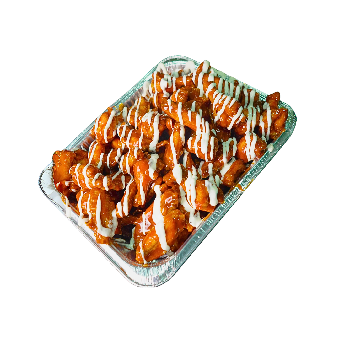 Fries, Quebec Curds, Gravy and Popcorn Chicken Drizzled with Garlic Sauce.